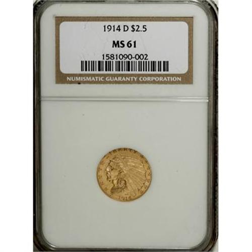 <B>1914-D $2 1/2 MS61 NGC.</B></I> NGC Census: (1456/4292). PCGS Population (441/2512). Mintage: 448,000. Numismedia Wsl. Price for NGC/PCGS coin in MS61: $380. (#7947)<BR><BR><B>Coin Engraver:</B> Bela Lyon Pratt<BR><BR><b>Shipping:</b> Coins & Currency (<a target="_blank" href="http://www.heritageauctions.com/common/shipping.php">view shipping information</a>)