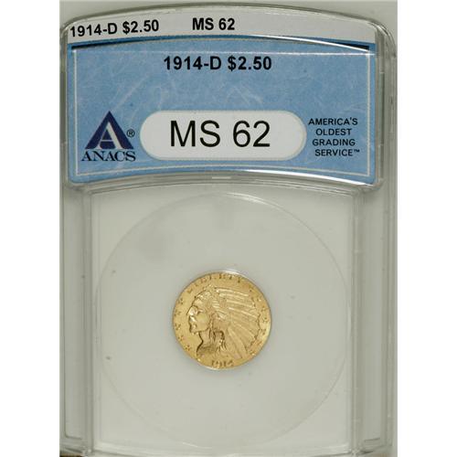 <B>1914-D $2 1/2 MS62 ANACS.</B></I> NGC Census: (2492/1637). PCGS Population (1256/1186). Mintage: 448,000. Numismedia Wsl. Price for NGC/PCGS coin in MS62: $525. (#7947)<BR><BR><b>Shipping:</b> Coins & Currency (<a target="_blank" href="http://www.heritageauctions.com/common/shipping.php">view shipping information</a>)