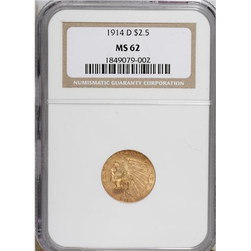 <B>1914-D $2 1/2 MS62 NGC.</B></I> NGC Census: (2471/1616). PCGS Population (1256/1186). Mintage: 448,000. Numismedia Wsl. Price: $525. (#7947)<BR><BR><b>Shipping:</b> Coins & Currency (<a target="_blank" href="http://www.heritageauctions.com/common/shipping.php">view shipping information</a>)
