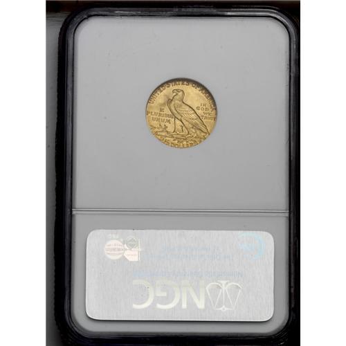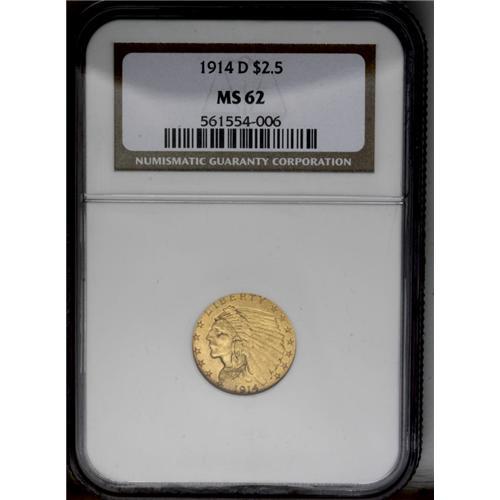 <B>1914-D<$2 1/2> MS62 NGC.</B></I> Satiny and typically struck with peach-gold and greenish toning and a few minor marks on each side. A scarce semi-key date in the Indian quarter eagle series.