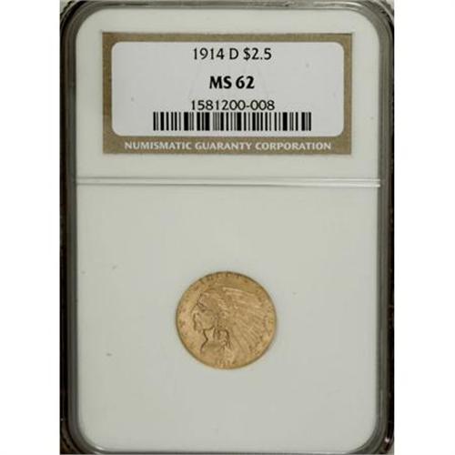 <B>1914-D $2 1/2 MS62 NGC.</B></I> NGC Census: (2556/1736). PCGS Population (1292/1291). Mintage: 448,000. Numismedia Wsl. Price for NGC/PCGS coin in MS62: $525. (#7947)<BR><BR><B>Coin Engraver:</B> Bela Lyon Pratt<BR><BR><b>Shipping:</b> Coins & Currency (<a target="_blank" href="http://www.heritageauctions.com/common/shipping.php">view shipping information</a>)