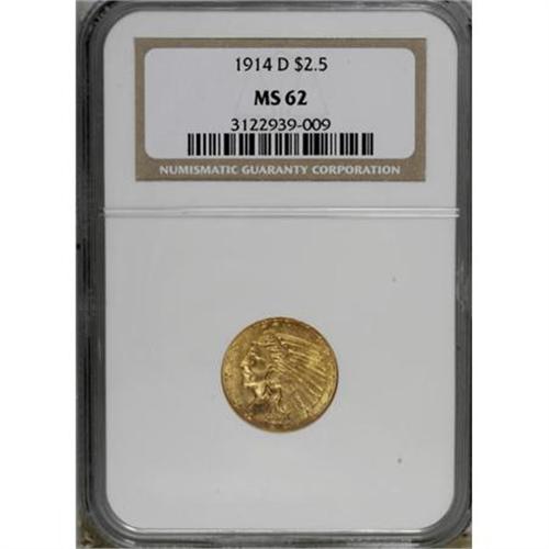 <B>1914-D $2 1/2 MS62 NGC.</B></I> . NGC Census: (2670/1829). PCGS Population (1361/1346). Mintage: 448,000. Numismedia Wsl. Price for NGC/PCGS coin in MS62: $510. (#7947)<BR><BR><B>Coin Engraver:</B> Bela Lyon Pratt<BR><BR><b>Shipping:</b> Coins & Currency (<a target="_blank" href="http://www.heritageauctions.com/common/shipping.php">view shipping information</a>)