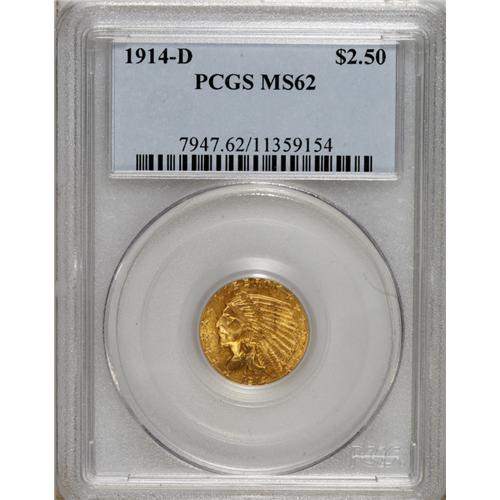 <B>1914-D $2 1/2 MS62 PCGS.</B></I> A lustrous apricot-gold example with only one consequential mark, which is concealed within the headdress. The strike is above average for the type, especially within the headdress.<BR><BR><b>Shipping:</b> Coins & Currency (<a target="_blank" href="http://www.heritageauctions.com/common/shipping.php">view shipping information</a>)