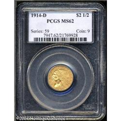 1914-D $2 1/2 MS62 PCGS. Boldly struck with pretty <B>1914-D $2 1/2 MS62 PCGS.</B></I> Boldly struck with pretty lime-green toning in the fields and vibrant red-gold highlights on the devices. A single noticeable pinscratch, on the upper reverse, is the only obvious grade-limiter, and, overall, the piece seems conservatively designated at the MS62 level. <BR><BR><B>Important notice:</B> Heritage usually auctions material at the rate of 200-250 lots per hour. On some occasions eBay Live bid software or the Internet may not be able to keep up with the pace of the auction. We recommend placing a realistic absentee bid now as insurance to avoid disappointment. Occasionally the auctioneer may eliminate or reject an eBay Live bid, and the auctioneer may also reopen a lot after the close of the eBay live bidding (usually because we missed an audience bid), and may reject your bid even if it shows you as the winning bidder. By bidding via eBay Live, you agree that Heritage may award the lot to another bidder at its sole discretion under the circumstances described above or any other reasonable circumstances. Since eBay bids are not shown to us until we open the lot on the floor, we treat those bids just like floor bids. In most cases the floor responds before the eBay bid is presented to us, due to Internet lag time, so for consistency we have made it a policy that floor bids are always considered first over tie eBay live bids. Also please note that all Heritage lots purchased through eBay Live carry a 20% Buyer's Premium. Please make sure you read the Terms and Conditions before you bid. This lot is being auctioned in conjunction with a live floor auction by Heritage Galleries & Auctioneers. All final auction and invoice information will be supplied by Heritage Galleries & Auctioneers, and all other information should be considered preliminary. Lot:6564
