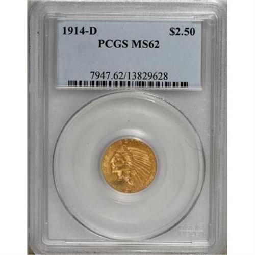 <B>1914-D $2 1/2 MS62 PCGS.</B></I> PCGS Population (1251/1213). NGC Census: (2534/1692). Mintage: 448,000. Numismedia Wsl. Price for NGC/PCGS coin in MS62: $525. (#7947)<BR><BR><B>Coin Engraver:</B> Bela Lyon Pratt<BR><BR><b>Shipping:</b> Coins & Currency (<a target="_blank" href="http://www.heritageauctions.com/common/shipping.php">view shipping information</a>\)