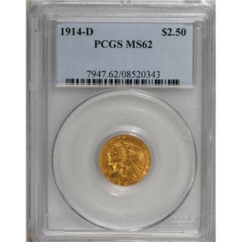 <B>1914-D $2 1/2 MS62 PCGS.</B></I> PCGS Population (1266/1248). NGC Census: (2556/1736). Mintage: 448,000. Numismedia Wsl. Price for NGC/PCGS coin in MS62: $525. (#7947)<BR><BR><B>Coin Engraver:</B> Bela Lyon Pratt<BR><BR><b>Shipping:</b> Coins & Currency (<a target="_blank" href="http://www.heritageauctions.com/common/shipping.php">view shipping information</a>)