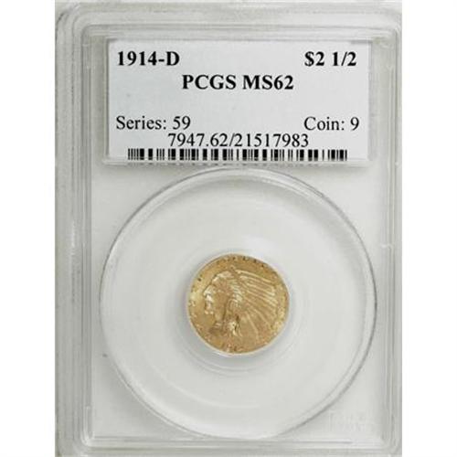 <B>1914-D $2 1/2 MS62 PCGS.</B></I> PCGS Population (1319/1311). NGC Census: (2641/1805). Mintage: 448,000. Numismedia Wsl. Price for NGC/PCGS coin in MS62: $520. (#7947)<BR><BR><B>Coin Engraver:</B> Bela Lyon Pratt<BR><BR><b>Shipping:</b> Coins & Currency (<a target="_blank" href="http://www.heritageauctions.com/common/shipping.php">view shipping information</a>)