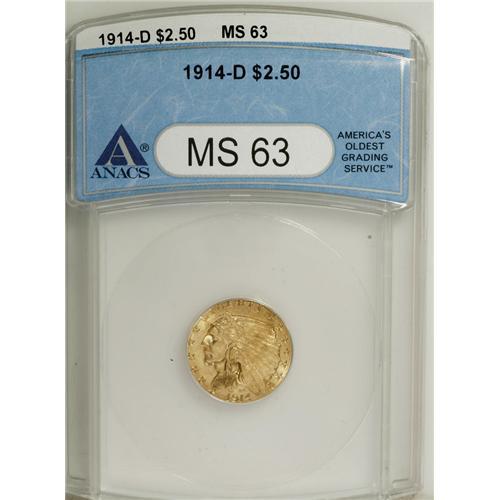 <B>1914-D $2 1/2 MS63 ANACS.</B></I> NGC Census: (1073/566). PCGS Population (714/458). Mintage: 448,000. Numismedia Wsl. Price for NGC/PCGS coin in MS63: $1,725. (#7947)<BR><BR><b>Shipping:</b> Coins & Currency (<a target="_blank" href="http://www.heritageauctions.com/common/shipping.php">view shipping information</a>)