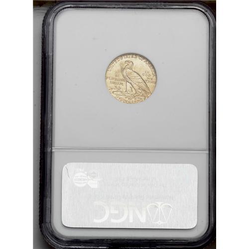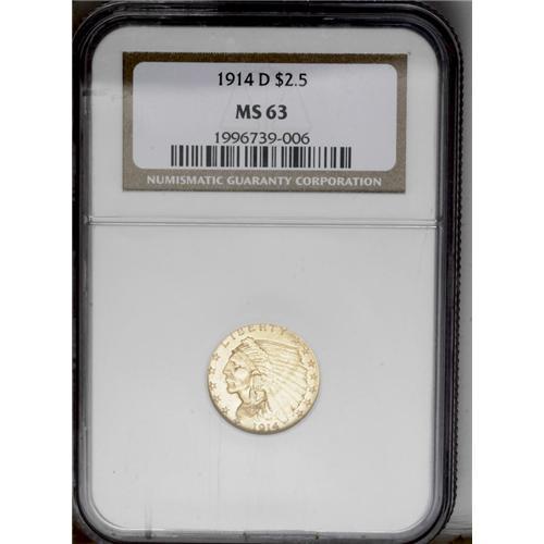 <B>1914-D<$2 1/2> MS63 NGC.</B></I> The highly lustrous surfaces reveal a bright brass-gold appearance, and the design elements are well executed, including crisp definition in the feathers on the eagle's shoulder. The mintmark exhibits typical weakness. Some minor handling marks are noted in the upper reverse field, but are fewer in number and severity than what might be expected for the grade designation. A very pleasing '14-D.