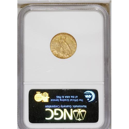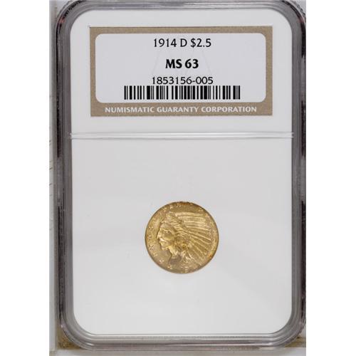 <B>1914-D $2 1/2 MS63 NGC.</B></I> This bright wheat-gold example displays nice satin luster and crisply defined design motifs. A few minor abrasions prevent a finer grade assessment. This issue becomes a significant semi-key date at the higher Uncirculated grade levels.<BR><BR><b>Shipping:</b> Coin/Currency (<a target="_blank" href="http://www.heritageauctions.com/common/shipping.php">view shipping information</a>)