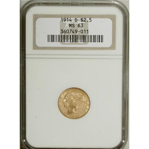 <B>1914-D $2 1/2 MS63 NGC.</B></I> This piece features attractive peach-gold surfaces with nice luster and sharply struck design elements. A few minor marks are noted in the exposed, raised fields, especially on the upper reverse.<BR><BR><b>Shipping:</b> Coin/Currency (<a target="_blank" href="http://www.heritageauctions.com/common/shipping.php">view shipping information</a>)