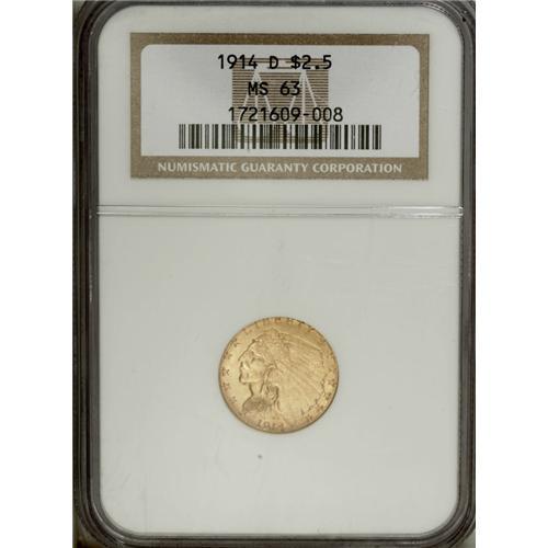 <B>1914-D $2 1/2 MS63 NGC.</B></I> This yellow-gold quarter eagle has strong, though slightly irregular luster. Several ticks appear on the portrait, which lacks definition on the feathers of the bonnet.<BR><BR><b>Shipping:</b> Coin/Currency (<a target="_blank" href="http://www.heritageauctions.com/common/shipping.php">view shipping information</a>)