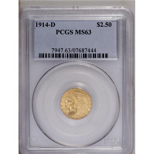 <B>1914-D<$2 1/2> MS63 PCGS.</B></I> Along with the key-date 1911-D and the much more available 1925-D, the 1914-D completes the triumvirate of D-mints for this popular and collectible series. This example offers lustrous khaki-gold surfaces, but some of the rear headdress feathers are a trifle softly struck, and a few light abrasions, on the Indian's cheek and scattered in the fields, define the grade.