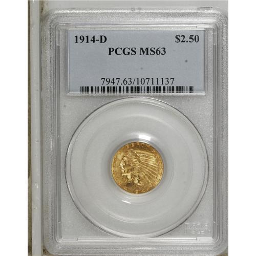 <B>1914-D $2 1/2 MS63 PCGS.</B></I> Crisply struck with attractive luster. The yellow-gold surfaces of this Select quarter eagle appear clean for the grade, though the reverse has a pair of short scrapes in the right field.<BR><BR><b>Shipping:</b> Coins & Currency (<a target="_blank" href="http://www.heritageauctions.com/common/shipping.php">view shipping information</a>)