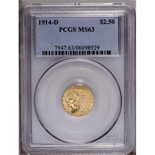 <B>1914-D<$2 1/2> MS63 PCGS.</B></I> Fully lustrous with a yellow-gold tint. The strike is strong and both sides display a few light contact marks that are typical for the assigned grade. <BR><BR><B>Important notice:</B> Heritage usually auctions material at the rate of 200-250 lots per hour. On some occasions eBay Live bid software or the Internet may not be able to keep up with the pace of the auction. We recommend placing a realistic absentee bid now as insurance to avoid disappointment. Occasionally the auctioneer may eliminate or reject an eBay Live bid, and the auctioneer may also reopen a lot after the close of the eBay live bidding (usually because we missed an audience bid), and may reject your bid even if it shows you as the winning bidder. By bidding via eBay Live, you agree that Heritage may award the lot to another bidder at its sole discretion under the circumstances described above or any other reasonable circumstances. Since eBay bids are not shown to us until we open the lot on the floor, we treat those bids just like floor bids. In most cases the floor responds before the eBay bid is presented to us, due to Internet lag time, so for consistency we have made it a policy that floor bids are always considered first over tie eBay live bids. Also please note that all Heritage lots purchased through eBay Live carry a 20% Buyer's Premium. Please make sure you read the Terms and Conditions before you bid. This lot is being auctioned in conjunction with a live floor auction by Heritage Galleries & Auctioneers. All final auction and invoice information will be supplied by Heritage Galleries & Auctioneers, and all other information should be considered preliminary. Lot:2508 <BR><BR><B>Winning Notification and Billing:</B> After the FINAL session in this auction is complete, Heritage will send e-mail and snail mail invoices. This process normally takes several days. All final auction and invoice information will be supplied by Heritage Galleries & Auctioneers, and all other information should be considered preliminary. <BR><BR>This auction will be conducted on a live auction floor and over the Internet through eBay Live. If you choose to place an absentee bid, please take a moment to <font color='#0000ff'><u><a href='http://pages.ebay.com/liveauctions/help/before/laabsentee.html'>learn how eBay Live absentee bidding works</a></u></font><font color='#000000'>