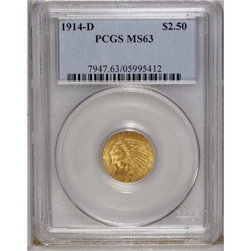 <B>1914-D $2 1/2 MS63 PCGS.</B></I> Select with an unusually bold strike. The reverse has stronger luster than the lightly marked obverse, which is lemon-yellow with orange accents.<BR><BR><b>Shipping:</b> Coin/Currency (<a target="_blank" href="http://www.heritageauctions.com/common/shipping.php">view shipping information</a>)