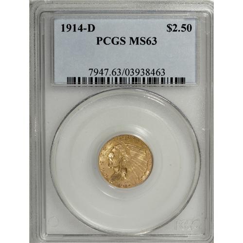 <B>1914-D $2 1/2 MS63 PCGS.</B></I> Swirls of emerald-gold and orange grace each side of this shimmering and solidly struck Select piece. A lightly abraded example of the penultimate branch mint quarter eagle issue.<BR><BR><b>Shipping:</b> Coins & Currency (<a target="_blank" href="http://www.heritageauctions.com/common/shipping.php">view shipping information</a>)