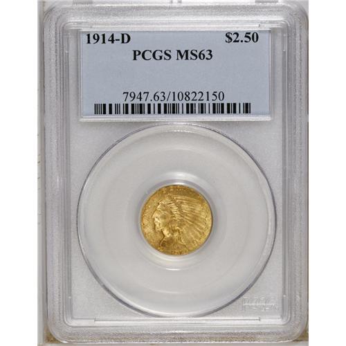 <B>1914-D $2 1/2 MS63 PCGS.</B></I> The lustrous yellow-orange surfaces of this Select piece are tinged with violet. Aside from a diagonal stripe that affects part of the headdress, the strike is solid.<BR><BR><b>Shipping:</b> Coin/Currency (<a target="_blank" href="http://www.heritageauctions.com/common/shipping.php">view shipping information</a>)