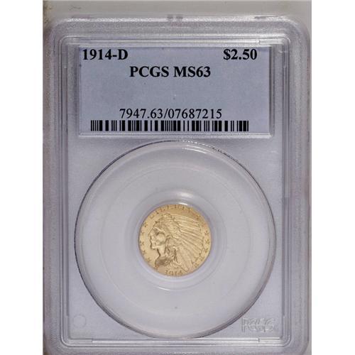 <B>1914-D<$2 1/2> MS63 PCGS.</B></I> The surfaces are greenish-gold, with muted luster. A couple of light scrapes--one on the Indian's cheek, a pinscratch above the eagle, and a third that might be evidence of a strike-through, an arcing pattern in the rear headdress feathers--account for the grade.
