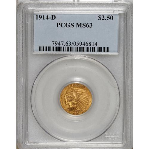 <B>1914-D $2 1/2 MS63 PCGS.</B></I> This Select representative has highly lustrous yellow-gold centers with deeper orange tones near the rims. Crisply defined, even at the often-troublesome legs of the eagle, with strong eye appeal for the grade.<BR><BR><b>Shipping:</b> Coins & Currency (<a target="_blank" href="http://www.heritageauctions.com/common/shipping.php">view shipping information</a>)