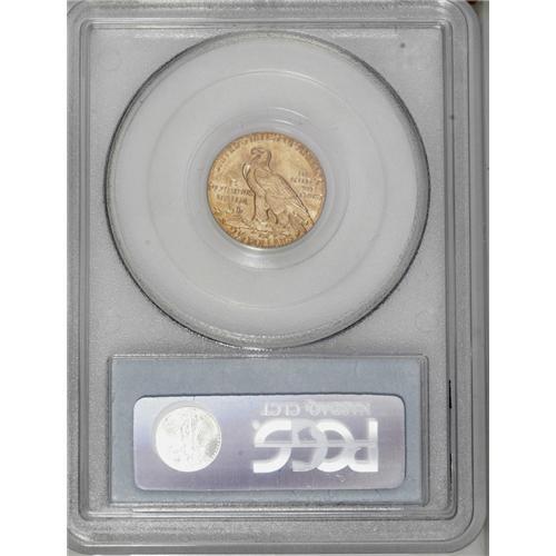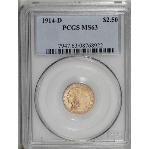 <B>1914-D<$2 1/2> MS63 PCGS.</B></I> This is the second of three Denver Mint quarter eagles of the design, and it is elusive in Mint State grades, despite a mintage of nearly half a million coins. This example is a tad weakly struck and has typical satin luster with brilliant yellow surfaces.