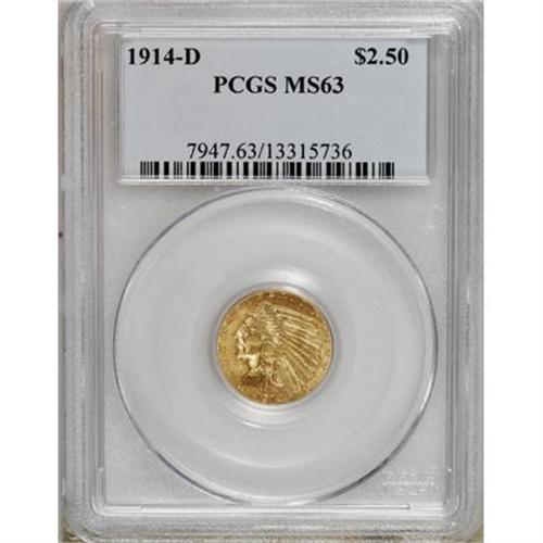 <B>1914-D $2 1/2 MS63 PCGS.</B></I> Lovely, swirling luster graces the lemon-gold centers and the slightly duskier antique-gold margins. Well-defined for this D-mint issue and a coin that displays attractively.<BR><BR><B>Coin Engraver:</B> Bela Lyon Pratt<BR><BR><b>Shipping:</b> Coins & Currency (<a target="_blank" href="http://www.heritageauctions.com/common/shipping.php">view shipping information</a>)