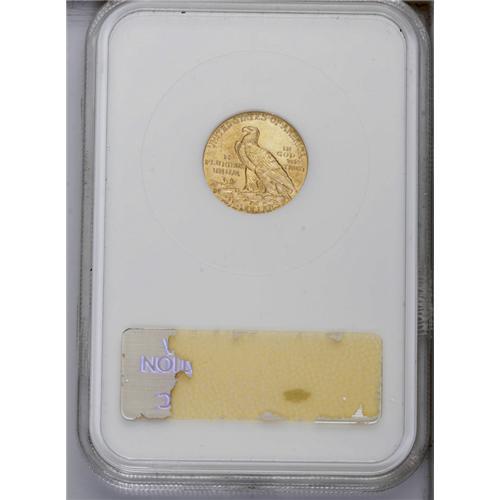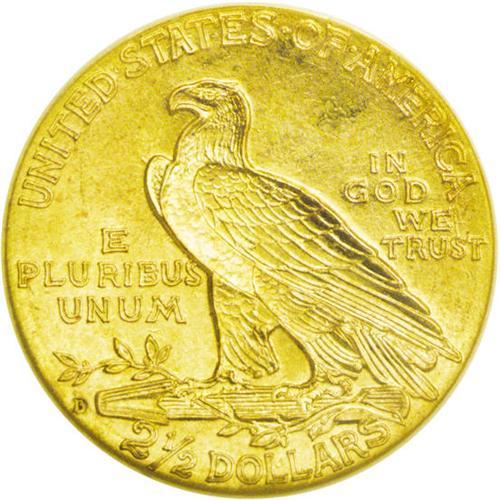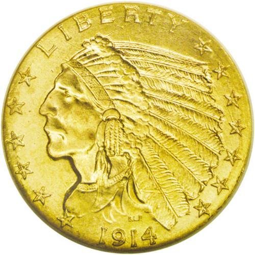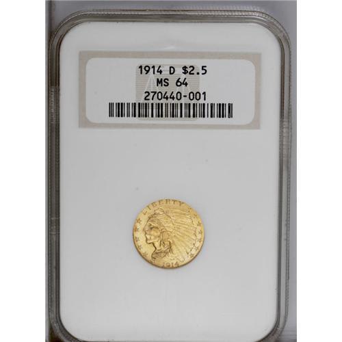<B>1914-D<$2 1/2> MS64 NGC.</B></I> A lovely near-Gem that shines with luster. One noticeable break appears behind the eagle's head, though this is fairly trivial. Boldly struck with orange-gold surfaces that have just a few too many marks for a higher grade. After MS63, the available population of almost every issue of this design falls off drastically.