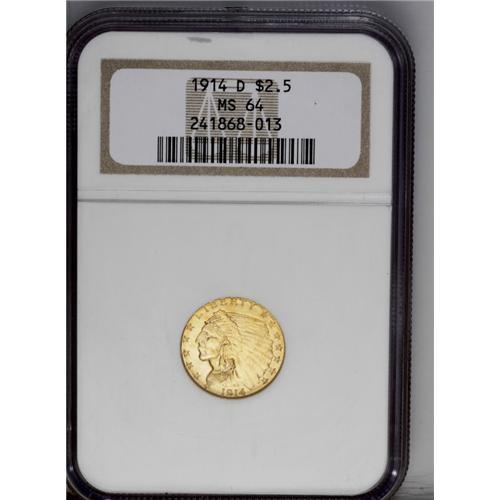 <B>1914-D $2 1/2 MS64 NGC.</B></I> Although the 1914-D attracts little interest in typical Mint State grades, it emerges as the greatest conditional rarity of the series at the MS65 level. Even near-Gems are surprisingly scarce, given the production of 448,000 pieces and the fact that quarter eagles circulated infrequently by 1914. This fully lustrous near-Gem has clean surfaces and good eye appeal. Portions of the headdress are softly brought up, although the remainder of the designs are crisp.<BR><I>From The Jones Beach Collection.</B></I><BR><BR><b>Shipping:</b> Coin/Currency (<a target="_blank" href="http://www.heritageauctions.com/common/shipping.php">view shipping information</a>)