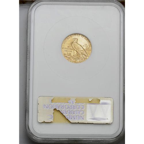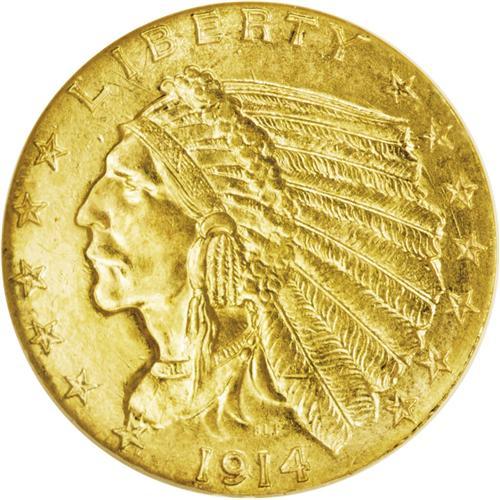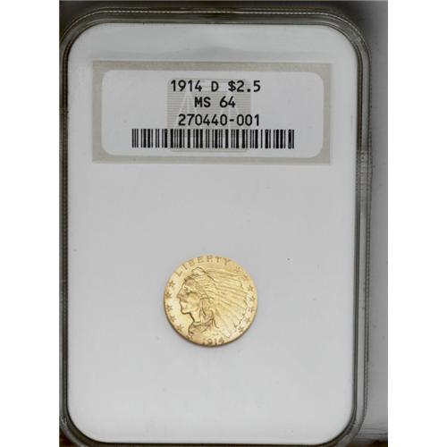 <B>1914-D<$2 1/2> MS64 NGC.</B></I> This orange-gold better date quarter eagle is lustrous and crisply struck. The fields display minor marks that are appropriate for the grade. The mintage of the 1914-D does not stand out within the series, but NGC has certified just 22 pieces at the MS65 level, fewer than any other issue including the famed '11-D. Certified in a prior generation holder.<BR><I>Ex: Philadelphia Signature (Heritage, 8/00), lot 7183.</B></I>