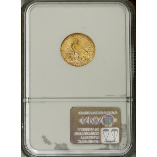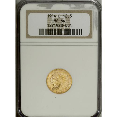 <B>1914-D $2 1/2 MS64 NGC.</B></I> European hoards are a well-established source for many United States gold issues, but coins of some years found their way overseas in lesser numbers. In particular, World War I and its aftermath inhibited the transfer of such pieces, which makes them less available today than comparable issues of earlier or later years. This bright piece is canary-gold with lemon-yellow on the obverse and a splash of orange on the reverse. The strike is solid, and only one abrasion, just above the top feather in the headdress, deserves mention.<BR><BR><b>Shipping:</b> Coin/Currency (<a target="_blank" href="http://www.heritageauctions.com/common/shipping.php">view shipping information</a>)