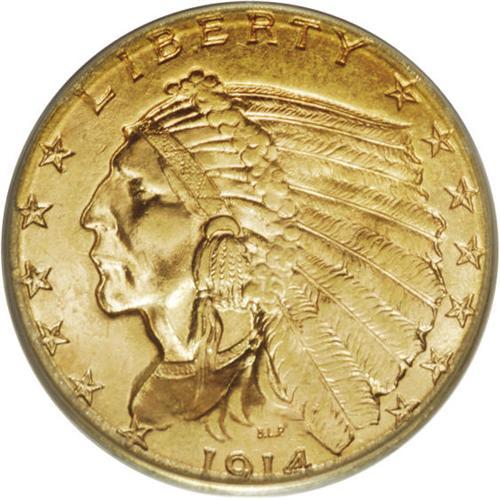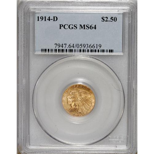 <B>1914-D $2 1/2 MS64 PCGS.</B></I> Despite the plentiful mintage of nearly a half-million pieces, the collecting public of the time failed to save many examples of this unpopular coinage, similar to another famous 1914-D coin, the Lincoln cent. This quarter eagle shows a better-than-expected strike, although a light unstruck area is noted on the Indian's cheek, opposite the highpoints of the eagle's wingtip. The orange-gold surfaces display gorgeous luster.<BR><BR><b>Shipping:</b> Coins & Currency (<a target="_blank" href="http://www.heritageauctions.com/common/shipping.php">view shipping information</a>)