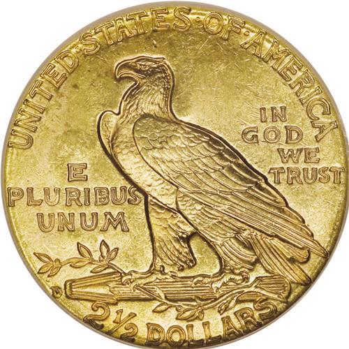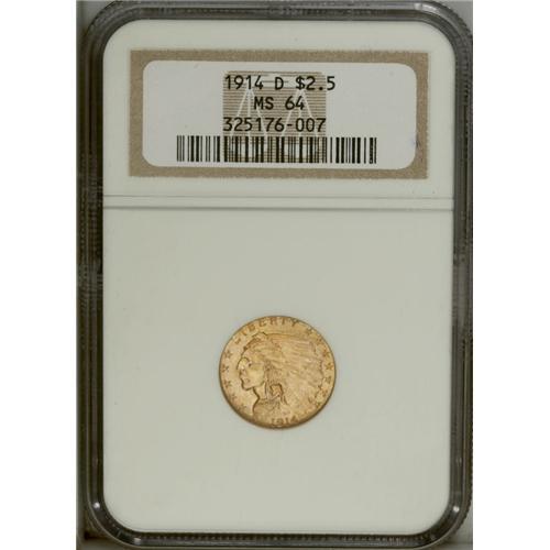 <B>1914-D $2 1/2 MS64 PCGS.</B></I> Lustrous and sharply defined on the design motifs, but showing evidence of die buckling near the obverse and reverse borders. The piece seems carefully preserved, with no mentionable abrasions on either side. The deep coppery-reddish-gold surfaces also display attractive lilac undertones. A pleasing, problem-free example of this scarce and important key date issue.<BR><BR><b>Shipping:</b> Coin/Currency (<a target="_blank" href="http://www.heritageauctions.com/common/shipping.php">view shipping information</a>)