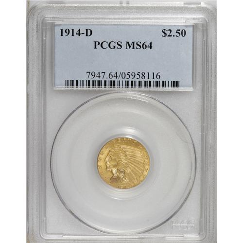 <B>1914-D $2 1/2 MS64 PCGS.</B></I> The 1914-D quarter eagle is generally available through the near-Gem level, but MS65 coins are a real challenge, and higher-grade specimens are virtually unobtainable. This MS64 example displays pretty apricot-gold and mint-green coloration and pleasing luster. Sharp definition is visible on the bonnet feathers, and on the eagle's leg and shoulder, areas that are frequently softly defined on this issue. Full Gem status is denied by a few minute marks.<BR><BR><b>Shipping:</b> Coins & Currency (<a target="_blank" href="http://www.heritageauctions.com/common/shipping.php">view shipping information</a>)