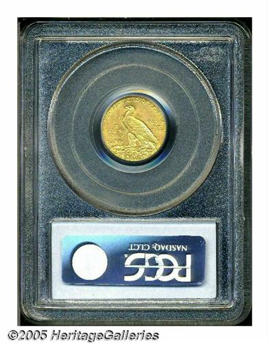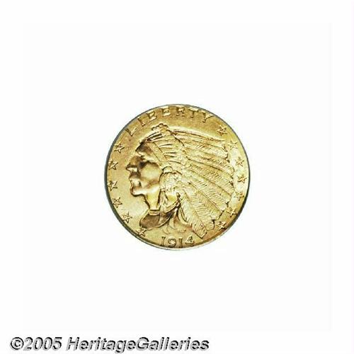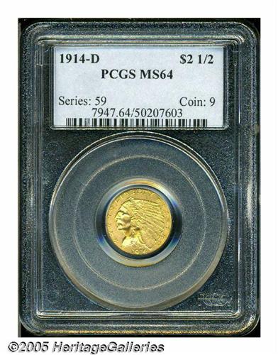 <B>1914-D<$2 1/2> MS64 PCGS.</B></I> The design details are well brought out on this near-Gem quarter eagle. Nice luster radiates through the apricot-gold patina, and the generally well preserved surfaces appear to be devoid of any significant marks. Overall a very attractive specimen.