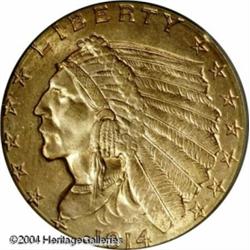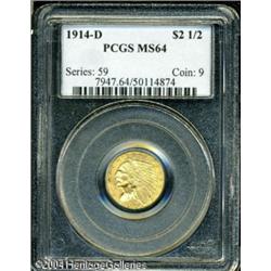 1914-D $2 1/2 MS64 PCGS. The design details are we <B>1914-D $2 1/2 MS64 PCGS.</B></I> The design details are well brought out on this near-Gem Quarter Eagle. Nice luster radiates through the apricot-gold patina, and the generally well preserved surfaces appear to be devoid of any significant marks. Overall a very attractive specimen. <BR><BR><B>Important notice:</B> Heritage usually auctions material at the rate of 200-250 lots per hour. On some occasions eBay Live bid software or the Internet may not be able to keep up with the pace of the auction. We recommend placing a realistic absentee bid now as insurance to avoid disappointment. Occasionally the auctioneer may eliminate or reject an eBay Live bid, and the auctioneer may also reopen a lot after the close of the eBay live bidding (usually because we missed an audience bid), and may reject your bid even if it shows you as the winning bidder. By bidding via eBay Live, you agree that Heritage may award the lot to another bidder at its sole discretion under the circumstances described above or any other reasonable circumstances. Since eBay bids are not shown to us until we open the lot on the floor, we treat those bids just like floor bids. In most cases the floor responds before the eBay bid is presented to us, due to Internet lag time, so for consistency we have made it a policy that floor bids are always considered first over tie eBay live bids. Also please note that all Heritage lots purchased through eBay Live carry a 20% Buyer's Premium. Please make sure you read the Terms and Conditions before you bid. This lot is being auctioned in conjunction with a live floor auction by Heritage Galleries & Auctioneers. All final auction and invoice information will be supplied by Heritage Galleries & Auctioneers, and all other information should be considered preliminary. Lot:6570