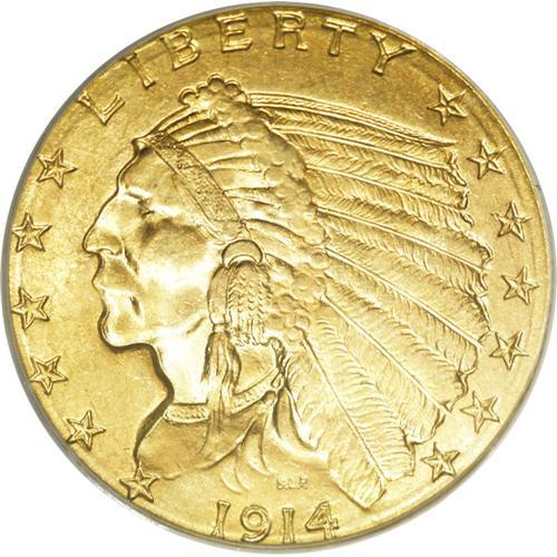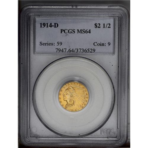 <B>1914-D<$2 1/2> MS64 PCGS.</B></I> The exceptional eye appeal is explained by the much better than average luster, a notable dearth of abrasions large or small, pretty two-toned surfaces with copper-gold and hazel areas, and a superior strike, if not completely full. This coin would fit nicely into a Gem date set at a fraction of the cost. PCGS has graded 34 pieces finer (3/06). <BR><BR><B>Important notice:</B> Heritage usually auctions material at the rate of 200-250 lots per hour. On some occasions eBay Live bid software or the Internet may not be able to keep up with the pace of the auction. We recommend placing a realistic absentee bid now as insurance to avoid disappointment. Occasionally the auctioneer may eliminate or reject an eBay Live bid, and the auctioneer may also reopen a lot after the close of the eBay live bidding (usually because we missed an audience bid), and may reject your bid even if it shows you as the winning bidder. By bidding via eBay Live, you agree that Heritage may award the lot to another bidder at its sole discretion under the circumstances described above or any other reasonable circumstances. Since eBay bids are not shown to us until we open the lot on the floor, we treat those bids just like floor bids. In most cases the floor responds before the eBay bid is presented to us, due to Internet lag time, so for consistency we have made it a policy that floor bids are always considered first over tie eBay live bids. Also please note that all Heritage lots purchased through eBay Live carry a 20% Buyer's Premium. Please make sure you read the Terms and Conditions before you bid. This lot is being auctioned in conjunction with a live floor auction by Heritage Galleries & Auctioneers. All final auction and invoice information will be supplied by Heritage Galleries & Auctioneers, and all other information should be considered preliminary. Lot:2510 <BR><BR><B>Winning Notification and Billing:</B> After the FINAL session in this auction is complete, Heritage will send e-mail and snail mail invoices. This process normally takes several days. All final auction and invoice information will be supplied by Heritage Galleries & Auctioneers, and all other information should be considered preliminary. <BR><BR>This auction will be conducted on a live auction floor and over the Internet through eBay Live. If you choose to place an absentee bid, please take a moment to <font color='#0000ff'><u><a href='http://pages.ebay.com/liveauctions/help/before/laabsentee.html'>learn how eBay Live absentee bidding works</a></u></font><font color='#000000'>