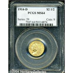 <B>1914-D<$2 1/2> MS64 PCGS.</B></I> The design details are well brought out on this near-Gem quarter eagle. Nice luster radiates through the apricot-gold patina, and the generally well preserved surfaces appear to be devoid of any significant marks. Overall a very attractive specimen. <BR><BR><B>Important notice:</B> Heritage usually auctions material at the rate of 200-250 lots per hour. On some occasions eBay Live bid software or the Internet may not be able to keep up with the pace of the auction. We recommend placing a realistic absentee bid now as insurance to avoid disappointment. Occasionally the auctioneer may eliminate or reject an eBay Live bid, and the auctioneer may also reopen a lot after the close of the eBay live bidding (usually because we missed an audience bid), and may reject your bid even if it shows you as the winning bidder. By bidding via eBay Live, you agree that Heritage may award the lot to another bidder at its sole discretion under the circumstances described above or any other reasonable circumstances. Since eBay bids are not shown to us until we open the lot on the floor, we treat those bids just like floor bids. In most cases the floor responds before the eBay bid is presented to us, due to Internet lag time, so for consistency we have made it a policy that floor bids are always considered first over tie eBay live bids. Also please note that all Heritage lots purchased through eBay Live carry a 20% Buyer's Premium. Please make sure you read the Terms and Conditions before you bid. </span></font></tr></table></td></tr></table>