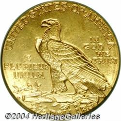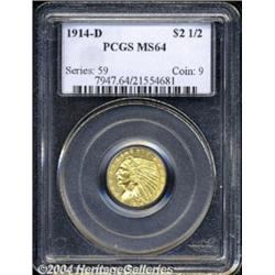 <B>1914-D<$2 1/2> MS64 PCGS.</B></I> A scarce, semi-key issue in the Indian quarter eagle series and a worthwhile issue in near-Gem condition. This is a fully struck example that has bright, sparkling mint luster, with no obvious abrasions on either side. <BR><BR><B>Important notice:</B> Heritage usually auctions material at the rate of 200-250 lots per hour. On some occasions eBay Live bid software or the Internet may not be able to keep up with the pace of the auction. We recommend placing a realistic absentee bid now as insurance to avoid disappointment. Occasionally the auctioneer may eliminate or reject an eBay Live bid, and the auctioneer may also reopen a lot after the close of the eBay live bidding (usually because we missed an audience bid), and may reject your bid even if it shows you as the winning bidder. By bidding via eBay Live, you agree that Heritage may award the lot to another bidder at its sole discretion under the circumstances described above or any other reasonable circumstances. Since eBay bids are not shown to us until we open the lot on the floor, we treat those bids just like floor bids. In most cases the floor responds before the eBay bid is presented to us, due to Internet lag time, so for consistency we have made it a policy that floor bids are always considered first over tie eBay live bids. Also please note that all Heritage lots purchased through eBay Live carry a 20% Buyer's Premium. Please make sure you read the Terms and Conditions before you bid. </span></font></tr></table></td></tr></table>