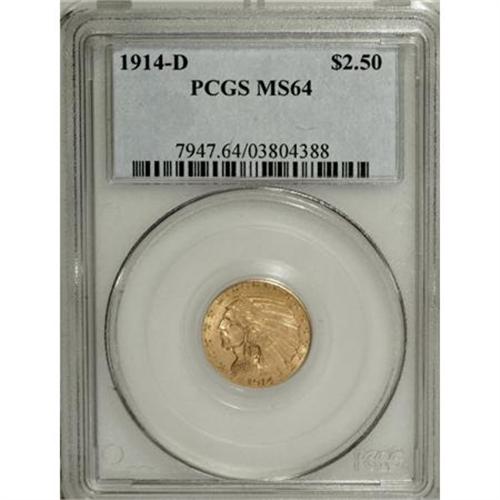 <B>1914-D $2 1/2 MS64 PCGS.</B></I> In addition to its recent recognition as a rarity in the Indian quarter eagle series, the 1914-D is also well known as a strike rarity. This particular coin, however, shows none of the softness usually seen, nor does it have the buckled appearance of many examples. The mint luster is bright and frosted with no obvious interruptions of post-striking impairments. This is a splendid Indian quarter eagle, regardless of the issue, and it is an especially noteworthy 1914-D.<BR><BR><b>Shipping:</b> Coins & Currency (<a target="_blank" href="http://www.heritageauctions.com/common/shipping.php">view shipping information</a>)