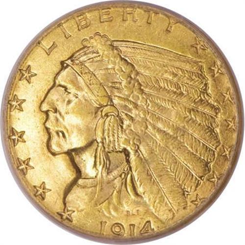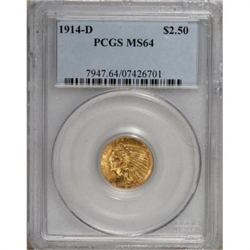 <B>1914-D $2 1/2 MS64 PCGS.</B></I> The 1914-D Indian quarter eagle is seldom encountered finer than MS64, and is second only to the key-date 1911-D in rarity at the Gem level. Perhaps due to public insecurities regarding the war raging in Europe, examples of this issue were not saved at the time of their release. This example offers compelling khaki-gold surfaces with only light abrasions consistent with the near-Gem assessment. PCGS has graded 35 pieces finer (6/07).<BR><BR><B>Coin Engraver:</B> Bela Lyon Pratt<BR><BR><b>Shipping:</b> Coins & Currency (<a target="_blank" href="http://www.heritageauctions.com/common/shipping.php">view shipping information</a>\)