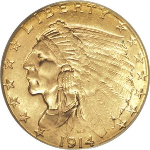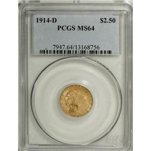 <B>1914-D $2 1/2 MS64 PCGS.</B></I> Brassy-gold surfaces display hints of light tan, along with pleasing luster. The strike on this near-Gem is above average, as the eagle's shoulder and leg feathers are much better defined than typically seen on the issue. We note a few unobtrusive handling marks, as well as a couple of tiny green specks.<BR><BR><B>Coin Engraver:</B> Bela Lyon Pratt<BR><BR><b>Shipping:</b> Coins & Currency (<a target="_blank" href="http://www.heritageauctions.com/common/shipping.php">view shipping information</a>)