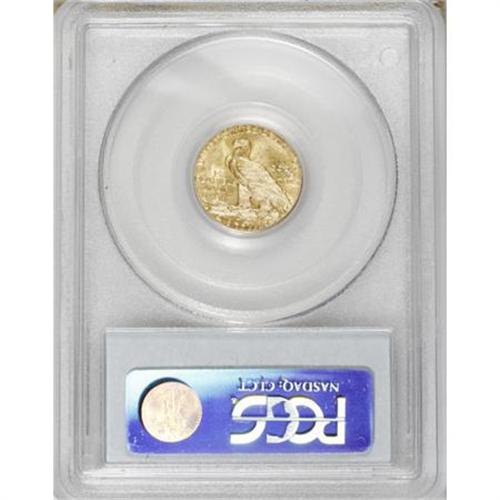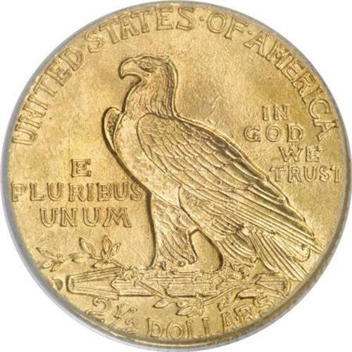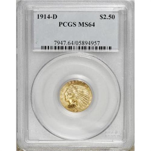 <B>1914-D $2 1/2 MS64 PCGS.</B></I> A sharply struck near-Gem with yellow-gold color resting upon pleasing luster. Some light handling marks in the raised exposed fields limit the grade. The 1914-D is available through MS64, but the population drops readily at the MS65 level. This piece will fit nicely in a high grade collection.<BR><BR><B>Coin Engraver:</B> Bela Lyon Pratt<BR><BR><b>Shipping:</b> Coins & Currency (<a target="_blank" href="http://www.heritageauctions.com/common/shipping.php">view shipping information</a>)
