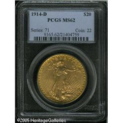<B>1914-D $20 MS62 PCGS.</B></I> Lightly abraded surfaces with pale yellow-gold luster. A pleasing example. Lot:9546