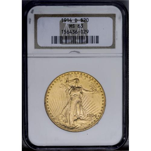 <B>1914-D<$20> MS63 NGC.</B></I> A bright, lustrous example that reveals rich golden surface colors and a solid strike. The few light marks present do not have an impact on its overall beauty.<BR><I>From The Steve Glenn Collection.</B></I> <BR><BR><B>Important notice:</B> Heritage usually auctions material at the rate of 200-250 lots per hour. On some occasions eBay Live bid software or the Internet may not be able to keep up with the pace of the auction. We recommend placing a realistic absentee bid now as insurance to avoid disappointment. Occasionally the auctioneer may eliminate or reject an eBay Live bid, and the auctioneer may also reopen a lot after the close of the eBay live bidding (usually because we missed an audience bid), and may reject your bid even if it shows you as the winning bidder. By bidding via eBay Live, you agree that Heritage may award the lot to another bidder at its sole discretion under the circumstances described above or any other reasonable circumstances. Since eBay bids are not shown to us until we open the lot on the floor, we treat those bids just like floor bids. In most cases the floor responds before the eBay bid is presented to us, due to Internet lag time, so for consistency we have made it a policy that floor bids are always considered first over tie eBay live bids. Also please note that all Heritage lots purchased through eBay Live carry a 20% Buyer's Premium. Please make sure you read the Terms and Conditions before you bid. This lot is being auctioned in conjunction with a live floor auction by Heritage Galleries & Auctioneers. All final auction and invoice information will be supplied by Heritage Galleries & Auctioneers, and all other information should be considered preliminary. Lot:4638 <BR><BR><B>Winning Notification and Billing:</B> After the FINAL session in this auction is complete, Heritage will send e-mail and snail mail invoices. This process normally takes several days. All final auction and invoice information will be supplied by Heritage Galleries & Auctioneers, and all other information should be considered preliminary. <BR><BR>This auction will be conducted on a live auction floor and over the Internet through eBay Live. If you choose to place an absentee bid, please take a moment to <font color='#0000ff'><u><a href='http://pages.ebay.com/liveauctions/help/before/laabsentee.html'>learn how eBay Live absentee bidding works</a></u></font><font color='#000000'>