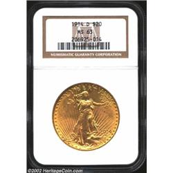 1914-D $20 MS63 NGC. Not overly abraded, both sides are predominantly olive-gold in color. The surfa