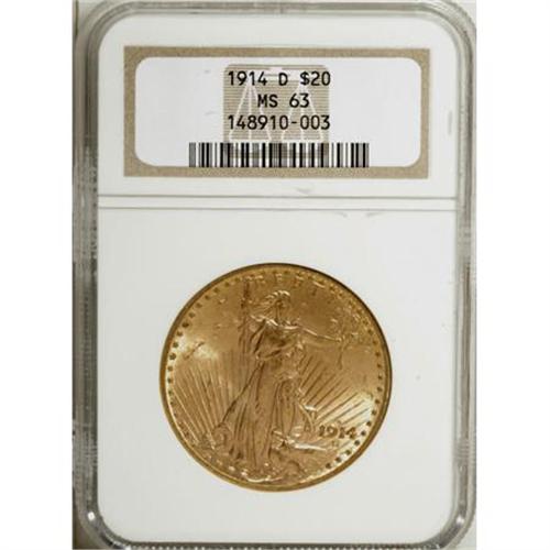 <B>1914-D $20 MS63 NGC.</B></I> NGC Census: (1563/2275). PCGS Population (1397/2542). Mintage: 453,000. Numismedia Wsl. Price for NGC/PCGS coin in MS63: $935. (#9165)<BR><BR><B>Coin Engraver:</B> Augustus Saint-Gaudens<BR><BR><b>Shipping:</b> Coins & Currency (<a target="_blank" href="http://www.heritageauctions.com/common/shipping.php">view shipping information</a>)