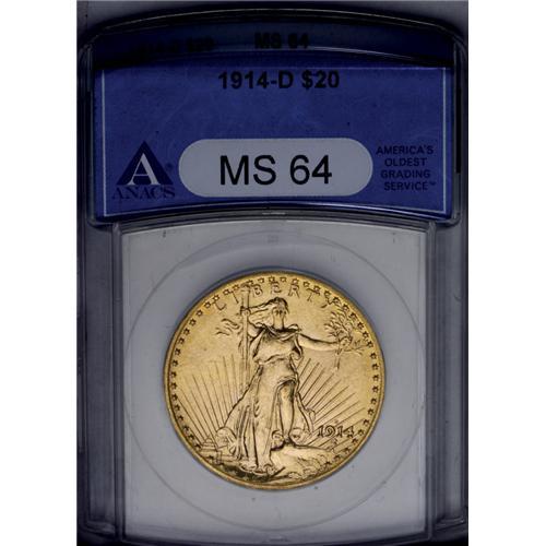 <B>1914-D<$20> MS64 ANACS.</B></I> Highly lustrous with the pebbly, matte-like finish that is normally seen on this issue. Minimally marked for the assigned grade, an excellent selection as a type coin.