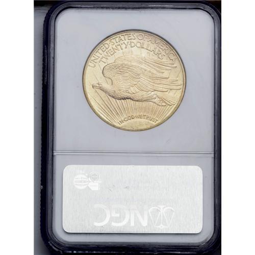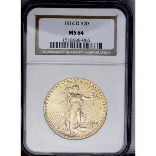 <B>1914-D<$20> MS64 NGC.</B></I> Sharply struck with a few noticeable marks on each side, limiting the grade of this example. Both sides have frosty yellow luster and wispy pink toning. A relatively low production totaled just 453,000 coins.