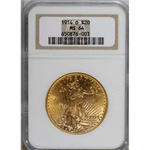 <B>1914-D $20 MS64 NGC.</B></I> This Choice D-mint double eagle offers vibrant yellow-gold surfaces with small glints of paler canary color. Well-defined with light, scattered marks and a handful of grade-defining abrasions.<BR><BR><B>Coin Engraver:</B> Augustus Saint-Gaudens<BR><BR><b>Shipping:</b> Coins & Currency (<a target="_blank" href="http://www.heritageauctions.com/common/shipping.php">view shipping information</a>)