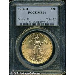 <B>1914-D $20 MS64 PCGS.</B></I> Brilliant and lustrous with frosty surfaces. Bright yellow-gold color. Lot:9548